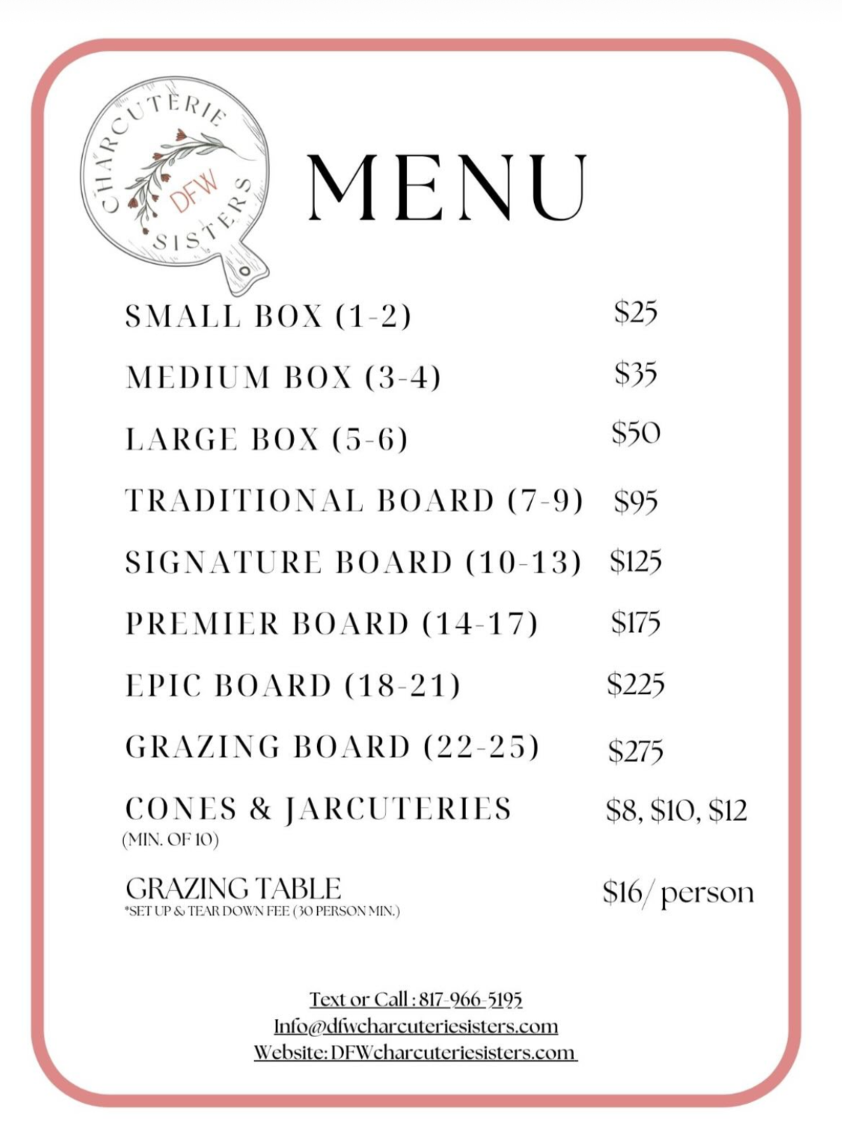 Text or Call to Order: 817.966.5195 or dfwcharcuteriesisters@gmail.com